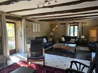 Nestling on the side of a hill at the end of a hidden valley, close to the medieval bastide of Najac, the first glimpse of La Sérénité, framed by walnut trees, is its steeply pitched roof atop beautifully restored stone walls. As you arrive along the sweep of drive, the impressive stone façade of this stunning property is revealed in all its glory.