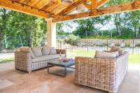 Thoughtfully considered, using high-quality stonework and exposed wooden beams the covered terrace is just the spot for a glass of something cold while soaking up the views. An open-plan kitchen, dining and living space strikes a perfect balance between rustic character and contemporary design, with a soft, neutral palette that complements the natural textures of the villa. The bright, spacious kitchen is ideal for concocting anything from a leisurely breakfast to a full evening meal, or simply preparing cocktails to enjoy on the patio after a day in the sun.