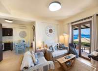 Designed for comfort and relaxation, the villa features an open-plan living and kitchen area which opens out to the sea-facing terrace. Both bedrooms are located on the top level, to maximise the wonderful views, with direct balcony access that makes waking up here something special. Exterior steps lead down from the living space to the pool and terrace area – ideal for soaking up the sun or enjoying peaceful swims in a private setting.