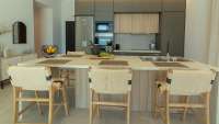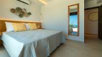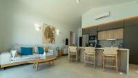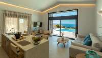 Inside, light pours through wide patio doors, framing the blue of the Ionian Sea. The open-plan living area is airy and uncluttered, leading directly to a terrace positioned to capture those mesmerising views. A sleek, compact kitchen, complete with breakfast bar, is ideal to plan to day ahead and enjoy your morning coffee.