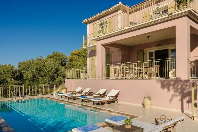 Outside, the villa offers spacious living spaces, including a covered dining terrace and a built-in barbecue, ideal for long, lazy meals with a view. Steps lead down to your private swimming pool, with ladder access and is surrounded by a sun terrace with loungers and uninterrupted views across the Ionian Sea.