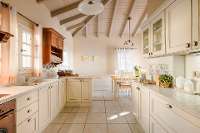 The interiors are light and airy, combining soft, neutral tones with traditional touches such as exposed wooden beams and tiled floors. Large windows and patio doors throughout the villa flood the space with natural light and draw your gaze toward the sea beyond.