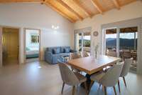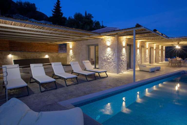 From its commanding hillside position, this brand new villa boasts uninterrupted panoramic views across the deep blue sea of Vasiliki Bay as well as the rolling green hills of the valley below. The mesmerising view here is constant throughout the day, from the first morning light to golden sunsets and twinkling evening lights across the town and boats below.