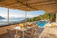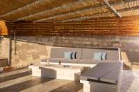 The villa aims to make the most of outdoor living. A spacious partly shaded terrace, finished with a natural reed pergola and ambient lighting, provides an idyllic setting for long leisurely meals while gazing out to sea. The infinity edge swimming pool sits proudly at the edge of the terrace, seamlessly blending into the horizon and offering a spectacular backdrop for a cooling dip. Sun loungers, comfortable exterior furnishings, combined with a unique in-built seating area, complete the outside space. Choose from where you prefer to read your book or sip an early evening cocktail. A portable barbecue complements the shaded dining area, making it easy to enjoy evenings cooking and dining al fresco as the sun sets behind the hills.
