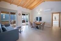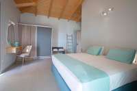 Inside, Ponti Monti has a bright, contemporary and welcoming feel. The open plan living space combines a stylish lounge and dining area, as well as a fully equipped kitchen, all thoughtfully arranged to maximise space and light. Two sets of large patio doors open directly onto the terrace, allowing the stunning views and sea breezes to flow effortlessly throughout the villa. Either side of the living area there is an elegant bedroom, each designed with comfort and relaxation in mind. The double bedroom features an en suite shower room with direct access to the poolside terrace. On the other side, the twin bedroom is equally bright and inviting and also enjoys direct access to the exterior. It is next to a separate contemporary shower room with a double sink unit.