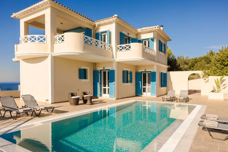 Perched in a peaceful, elevated position with uninterrupted sea vistas, Sea La Vie has been designed with both comfort and simplicity in mind. The living spaces rise over two main levels, linked by an internal spiral staircase that sweeps between the restful sleeping quarters, while the open plan social areas are posited on the first floor, where wide windows frame the glistening Ionian horizon.