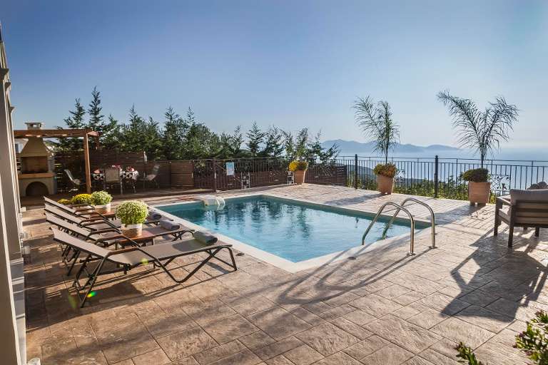 Perched on a quiet hillside above the olive-cloaked valley of Vasilikades, this graceful modern villa looks out across a wide expanse of blue, where the Ionian Sea meets the horizon in a shimmer of light.