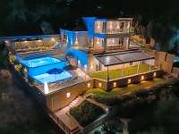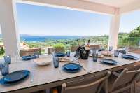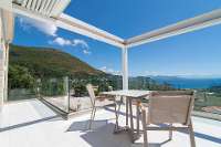 With five sumptuous bedrooms, each room is its own haven with far reaching sea views, carefully thought‑out terraces, ensuite shower rooms, verdant lawned terraces or terraces which provides your own access the unique situation of having two inviting pools to choose from. Communal areas include a bright and airy living room, which feature windows framing the shimmering sea, complete modern furnishings, and a serene atmosphere for relaxing or entertaining, while the dining areas can be found on the forward sea facing balcony, or at the rear of the property where the impressive in built barbeque and pizza oven are situated.