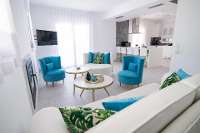 - Ground Floor: Open plan living (A/C, Smart TV, Wi-Fi) with doors to balcony, kitchen (oven, dishwasher, washing machine), breakafast bar (x 5 stools), with doors to covered balcony which has a large table for breakfast meals and dining. Double (or Twin) bedroom (A/C, Smart TV) with en-suite shower room, with doors to balcony. Cloakroom.