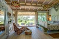 Floor-to-ceiling patio windows line the entire width of the property, giving access onto the covered terrace and the view over the garden to the olive grove beyond with tantalising glimpses of Lake Bolsena below. The hexagonal shaped pool sits at the centre of the garden, surrounded by lawn and olive trees with a border of hedges and trees.
