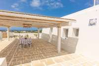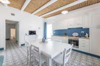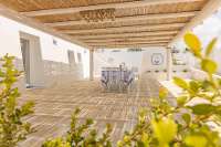 White walls form a courtyard in which you will find the villa, a spacious dining terrace with dappled shade, and on the upper level the pool area. Blue and white are the colours of choice, a simple yet effective theme. Inside, the patterned tiled floor is an eye catching backdrop for the pure white furniture, whilst outside, the sand coloured paved terraces are edged with Mediterranean plants.