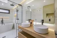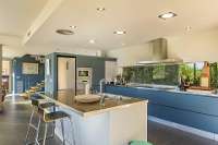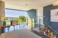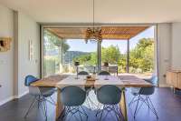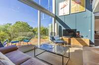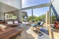 From the moment you walk into the entrance hall the open-plan living area unfolds below you, bathed in abundant natural light through sliding glass doors that blur the line between indoors and the outside. This contemporary home invites a sense of calm and connection with nature. A smart open-tread staircase of solid wood and polished steel leads you down to ground-floor relaxation and private terraces. The fully equipped kitchen with a centre island that doubles as a breakfast bar is as functional as it is sleek, perfect for casual meals or social cooking.