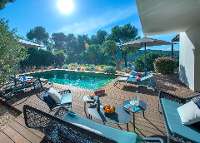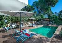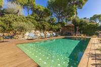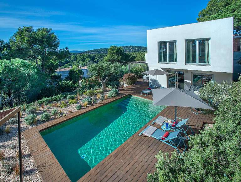 Step outside to your private oasis: a decked terrace surrounding a refreshing pool and teak pergola offers you a choice of delightful spots for morning coffee or sunset cocktails. The garden is a tapestry of shrubs, herbs, and olive trees that unfolds into rustic steps down to a backdrop of shady pines and oaks.