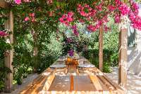 - Ground Floor: Split level open plan sitting/dining room (TV, WiFi, A/C, ceiling fan) with French doors to terrace. Kitchen (oven, dishwasher, microwave) with door to foliage-covered dining terrace. Double bedroom (A/C, ceiling fan) with en suite shower room. Twin bedroom (A/C). Two double bedrooms (A/C, ceiling fan). Two shower rooms.