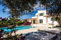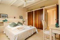 With light flooding in through French doors on its pool-facing façade, the open plan living room exudes a pleasing sense of spaciousness. Cream walls and light stone floors create a calming backdrop for attractive furnishings and fabrics displaying the colours of the coast; a neat galleried kitchen looks out across the dining area to the pool and sea beyond, and ceiling fans as well as air conditioning ensure comfort even in the height of the summer. The same stylish décor continues in the smartly presented bedrooms, four of which sit on the ground floor whilst the fifth enjoys sea views from its first floor windows upstairs.