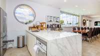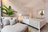 - Ground Level: Open plan kitchen/dining room (TV, A/C, comfortable seating area) with doors to pool terrace. Kitchen (3 fridges, electric oven, ceramic hob, 2 dishwashers, 2 coffee machines, 2 microwaves, toaster, kettle). Four double bedrooms (bed size 140cm) with A/C, TV and en suite bathroom (bathtub located beside the bed). Cloakroom.